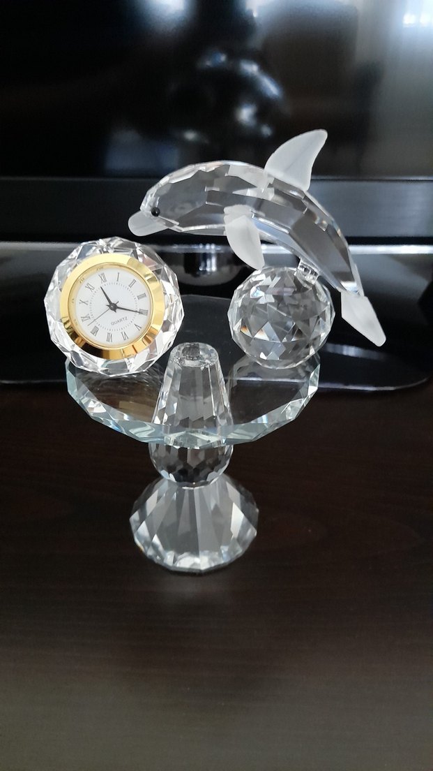 Altın detaylı küçük saat ve yunus figürlü kristal masa süsü, keskin yüzeyli taban üzerinde duruyor.