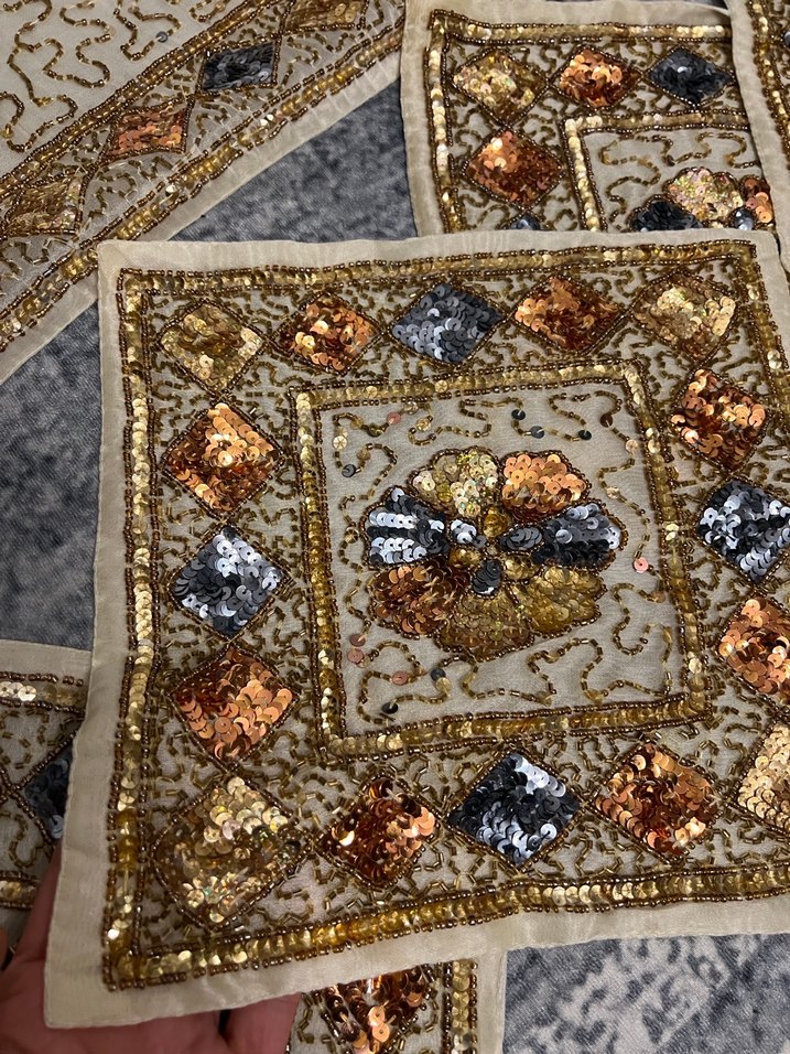 Koyu altın renginde, işlemeli ve payet detaylı bohem tarzda salon takımı, salonunuza şık bir dokunuş katar. ✨ El işlemesi boncuklu salon takımı 12 parça peçete, bir adet dikdörtgen orta sehpa, iki adet kare zigon sehpa, bir adet büyük masa örtüsü şeklinde toplam.16 parça salon takımı
