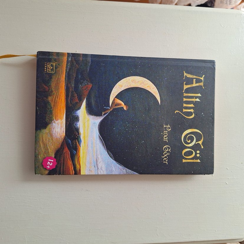 Pınar Göçer'in "Altın Göl" adlı romanı, hilal ay ve sakin bir doğa manzarası içeren kapağıyla 12 yaş ve üzeri okuyucular için uygun. sayfanın boş kısmında karalama var.