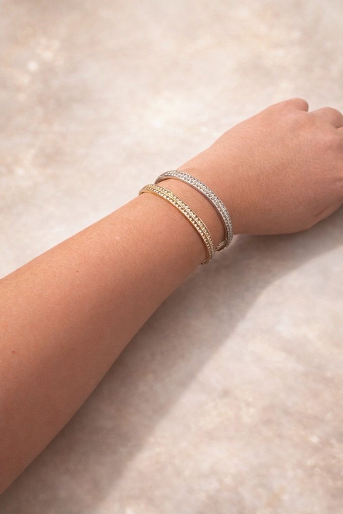 Altın veya gümüş rengi, taş detaylı deseni sade deseni olan bileklik, günlük kullanıma uygun. Tek başınada çok güzel durur. Bilekliklerin yanında kombin olarakta çok şık durur. 1 adet fiyatıdır.