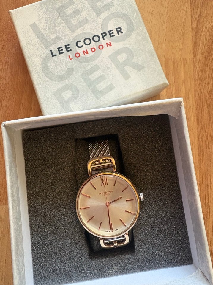 Lee Cooper marka, kemerli file kayışlı, açık bej renk kadranlı modern klasik tarzda kadın kol saati. ⌚gümüş ve altın detayları var. Sayılı kullanıldı hiçbir sorunu yoktur sarıldı