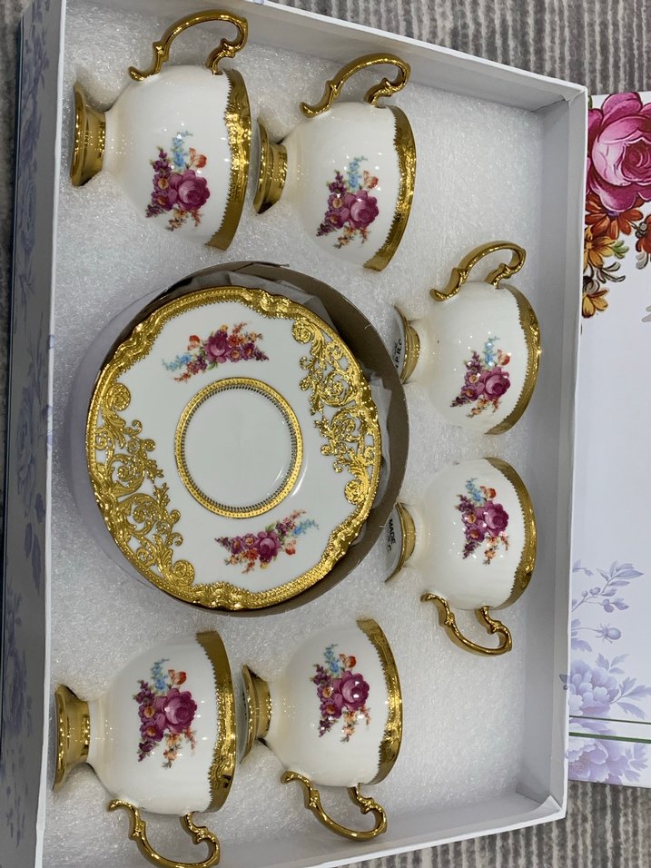 Altın işlemeli ve çiçek desenli beyaz fincanlar ve tabaklar içeren şık bir set. Zarif ve dekoratif tasarım.