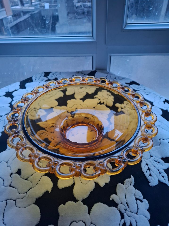 Kenarında altın işlemeli desen bulunan koyu tonlu cam tabak, klasik tarzı şık detaylarla buluşturuyor. Sunum veya dekor için uygun. ️32 cm çapında fotoda belirttiğim alt ayak kısmında görünmeyen bir atık var belli bile değil onun dışında kusursuz