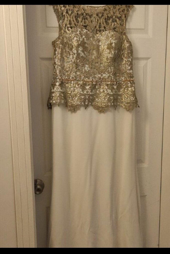 Uzun, kolsuz ve kayık yaka kesime sahip elbise, altın işlemeli dantel detaylarıyla vintage ve klasik şıklığı bir araya getirir. Düğünler için uygundur.