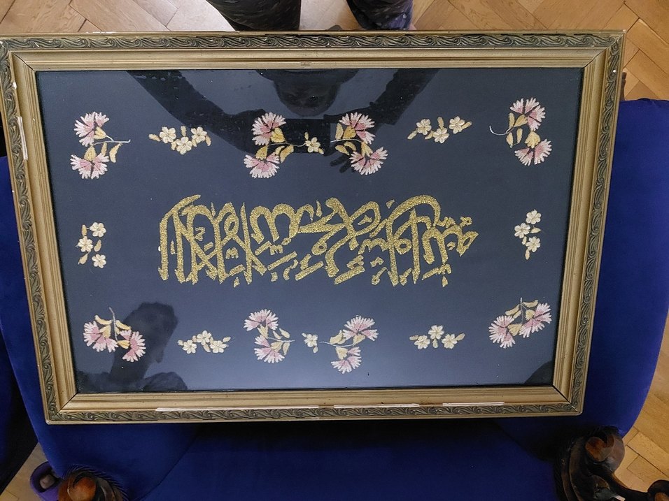 Altın renkli hat yazısı ve çiçek desenleri, koyu zemin üzerinde yer alır. Detaylı altın çerçeveli tablo.