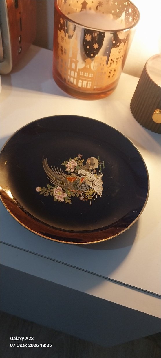Koyu renkli dekoratif tabakta altın işlemeli çiçek ve kuş desenleri bulunur, geleneksel tarzda şık bir sofra ve sunum ürünü. El boyaması tabak başlıklı antika/koleksiyon objesi Türkiye menşe’lidir. 1980-1990 arası dönemine aittir.