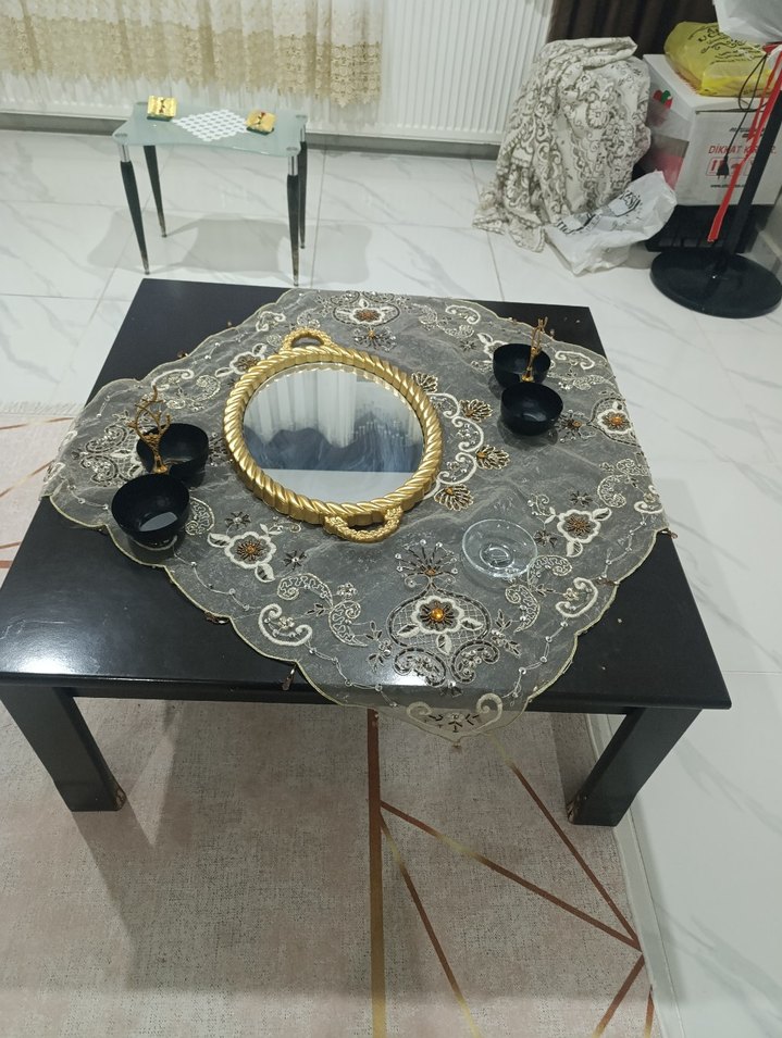 Altın renkli işlemelere sahip koyu renk masa örtüsü, masanıza zarif bir dokunuş katar.
