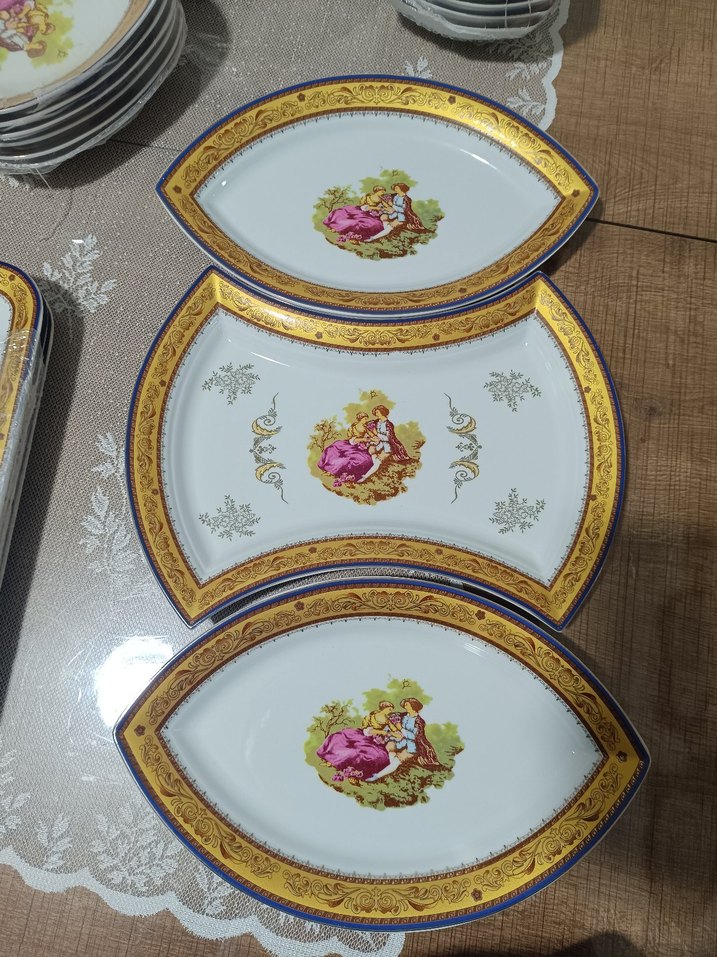 30 parça 6 kişilik ayrıyetten 6 tane de sunumluk. Koyu altın renginde, işlemeli desenlere ve klasik figürlere sahip geleneksel tabak seti. Şık sofralar için uygundur. ️