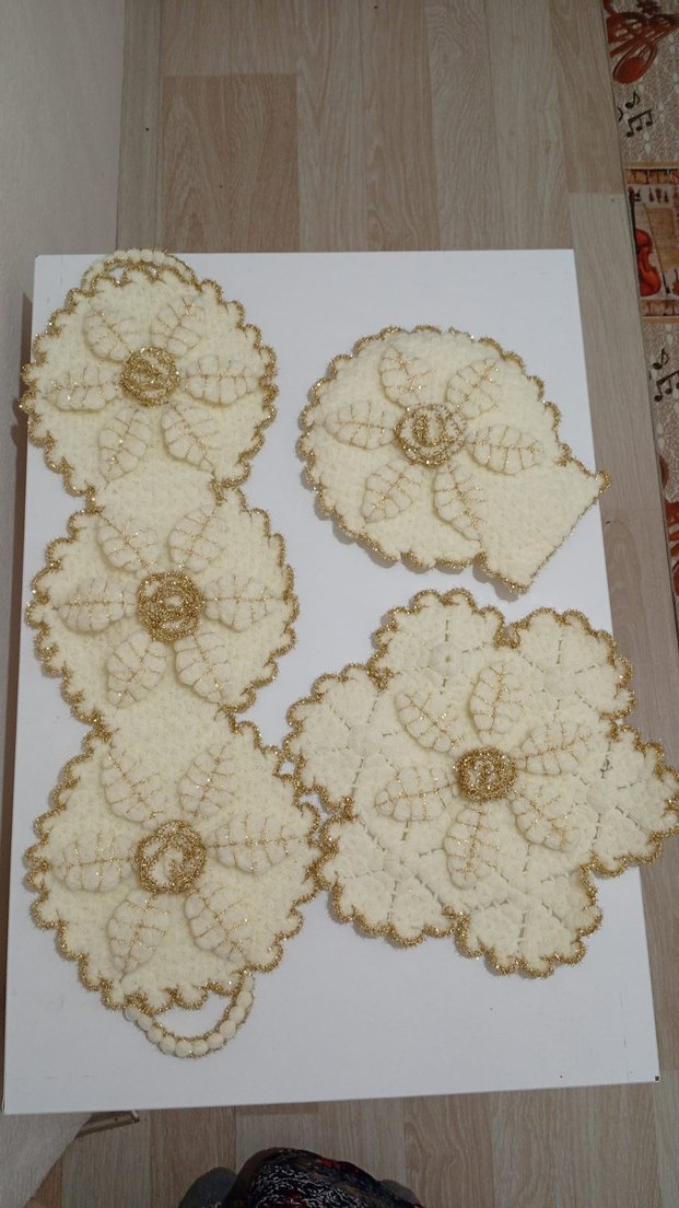 El örgüsü krem renginde, altın iplik işlemeli çiçek desenli parçalar. Kenarları altın detaylı dalgalı şekilde tamamlanmıştır.
