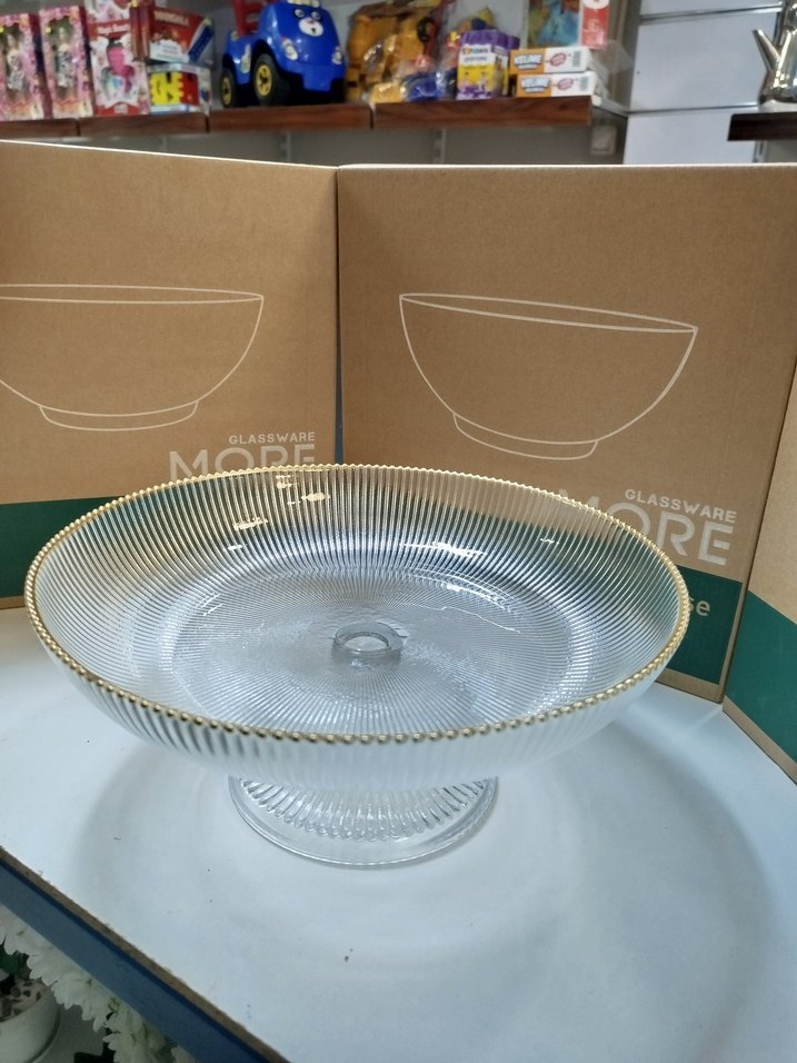 Altın işlemeli deseniyle modern klasik tarzda, camdan yapılmış ayaklı şık tabak. Sofranıza zarafet katacak.