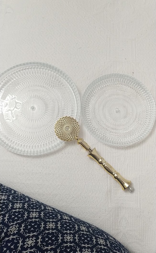 İki şeffaf dokulu tabak ve işlemeli altın renkli sapıyla modern klasik servis seti, şıklık ve işlevselliği bir arada sunar. ️