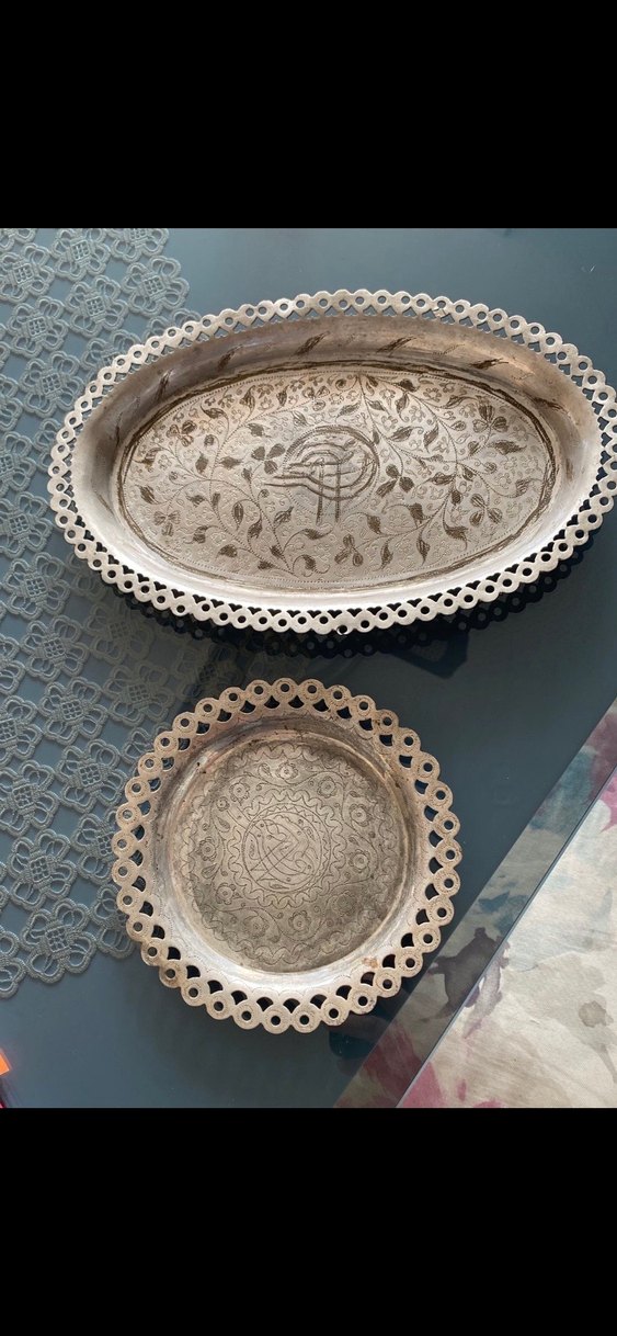 Parlak altın renkli oval ve yuvarlak tepsiler, işlemeli desenler ve dekoratif kenarlarla süslenmiştir. Sunum veya dekorasyon için uygundur. ️