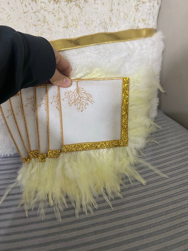 Parlak altın işlemeli ve tüy detaylı dekoratif yastık kılıfı, her odaya şıklık katıyor. ️