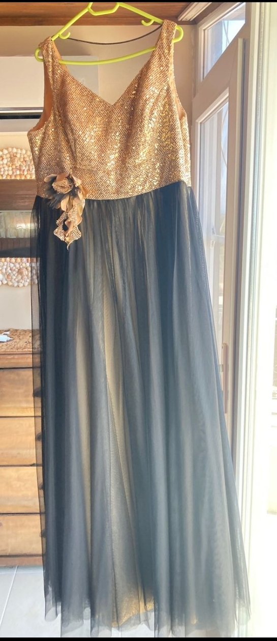 Altın işlemeli straplez üst kısmı ve dökümlü koyu renk etek kısmıyla bohem tarzda uzun abiye elbise. Kolsuz ve rahat kesim, düğün ve özel anlar için uygundur. ✨