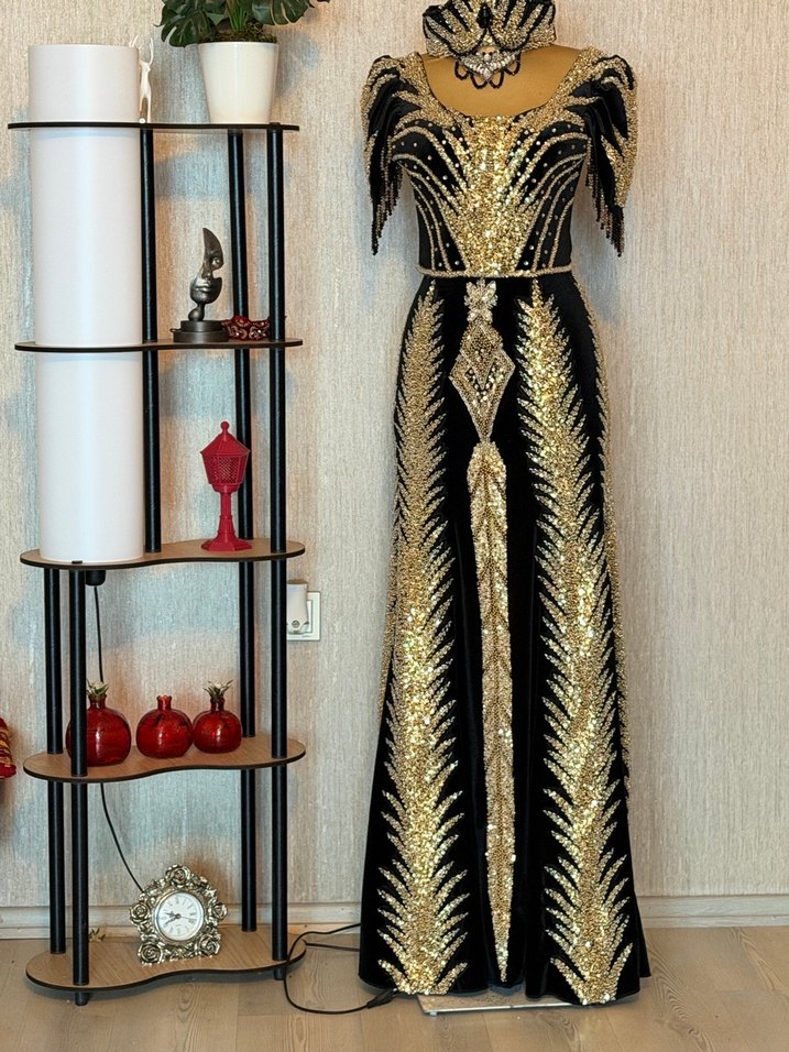 Altın İşlemeli Uzun Henna Elbise