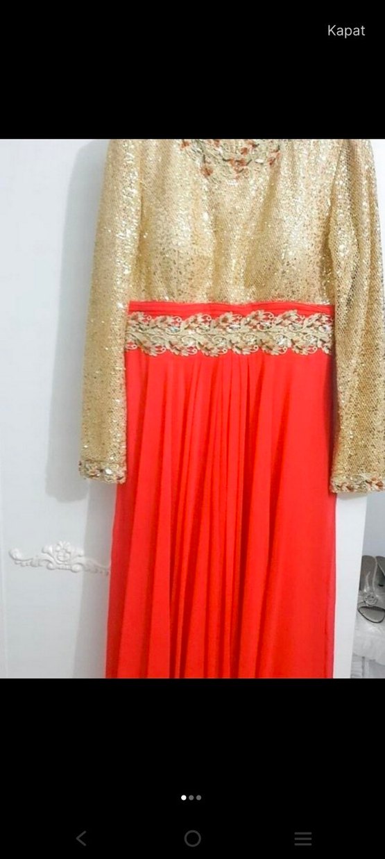 Parlak altın işlemeli üst kısmı, uzun kollu ve kayık yakalı bu dar kesim abiye elbise, drapeli kırmızı uzun etekle tamamlanmıştır. Düğünler için uygun. ✨