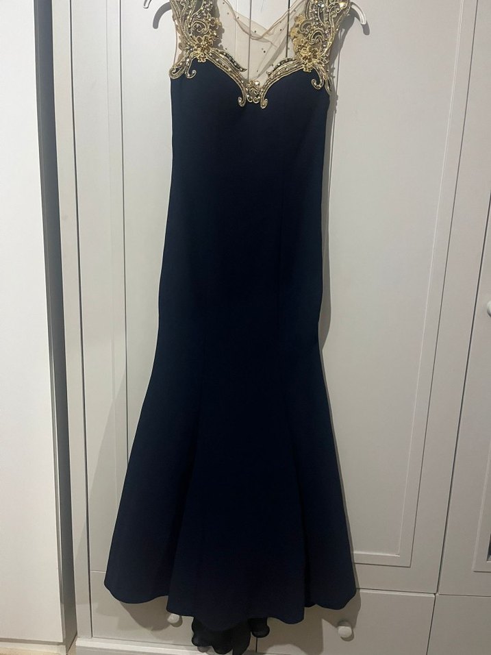 Dar kesim uzun abiye elbise, kolsuz ve drapeli. V yakası altın işlemeli, koyu zemin üzerinde modern klasik ve gotik tarzda, düğün için uygun.