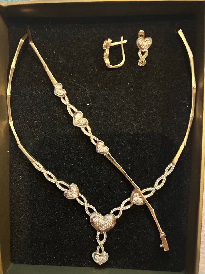 Altın renkli, zincir detaylı kolye ve nakışlı kalp desenli küpelerden ve bileklikden oluşan kadın takı seti, düğünler için uygun. 14 ayar 14 gram ağırlığındadır