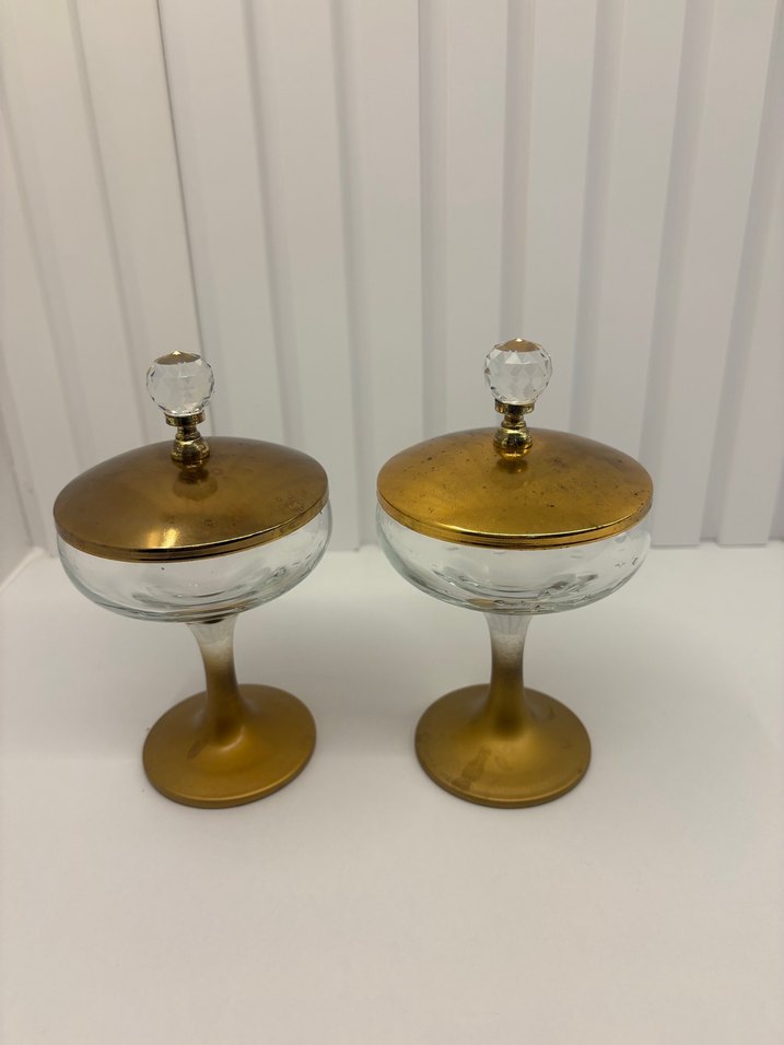 Üzerinde kristal top tutacağı bulunan, parlak altın kapak ve tabanlı cam ayaklı şekerlik ıkılı resımde gözüktüğü gıbı şekerliğin kapağında soyulmalar var onun dışında Herhangı sorunu yoktur resındede gözüküyor zaten