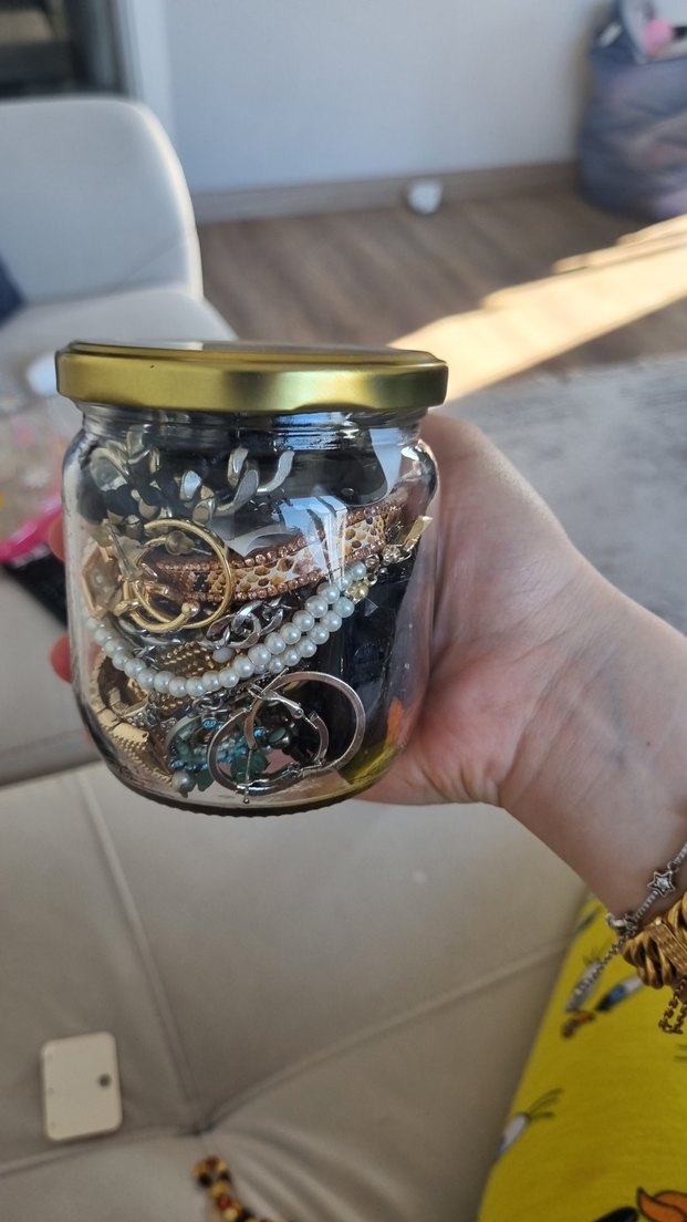 Altın kapaklı cam kavanoz içinde inci taneleri, küpeler ve zincirler gibi çeşitli takılar bulunuyor. Aksesuarlarınızı düzenlemek için kullanışlıdır. 24 25 urun vardir celik gumus ve bijuteri karisiktir fiyat icin dm