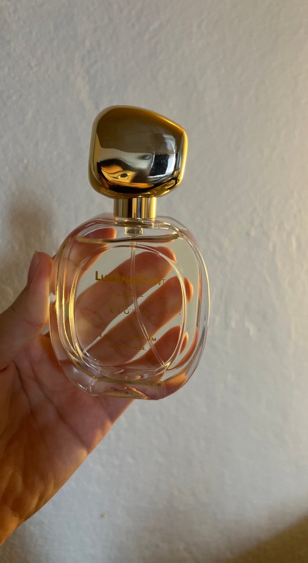 Şeffaf gövdeye ve parlak altın kapaklı, içinde hafif altın renkli sıvı bulunan kadın parfüm şişesi.
