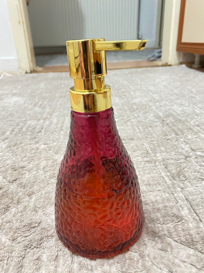 Altın renkli pompası ve kırmızı dokulu cam yapısıyla şık ve kullanışlı sıvı sabunluk. Kırık çıkık yoktur sağlam
