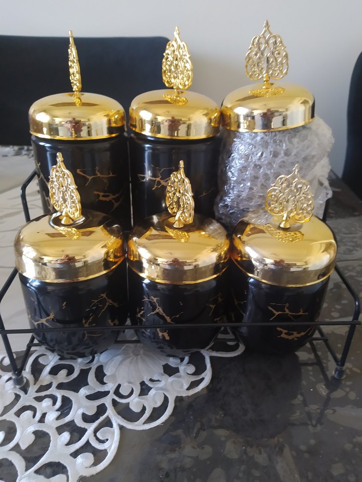 Bu mutfak aksesuar seti, süslü kulplu koyu altın kapaklı altı siyah kap içerir, baharatları düzenlemek için uygundur.