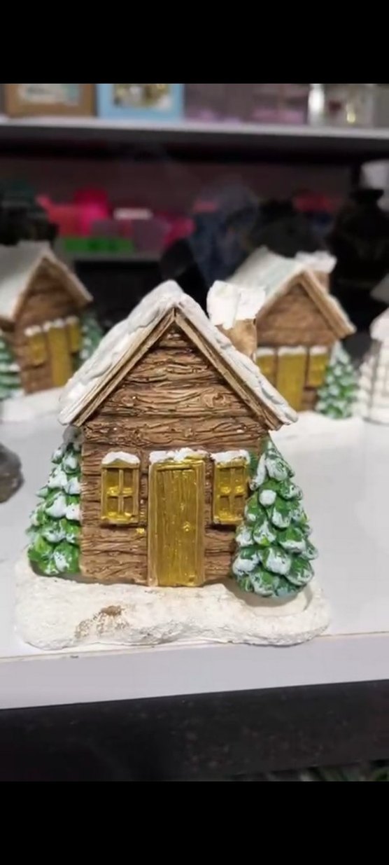 Renkli figür, altın kapı ve pencerelere sahip küçük bir ev ile karla kaplı yeşil ağaçları içerir. Sıcak bir kış atmosferi sunar. ❄️