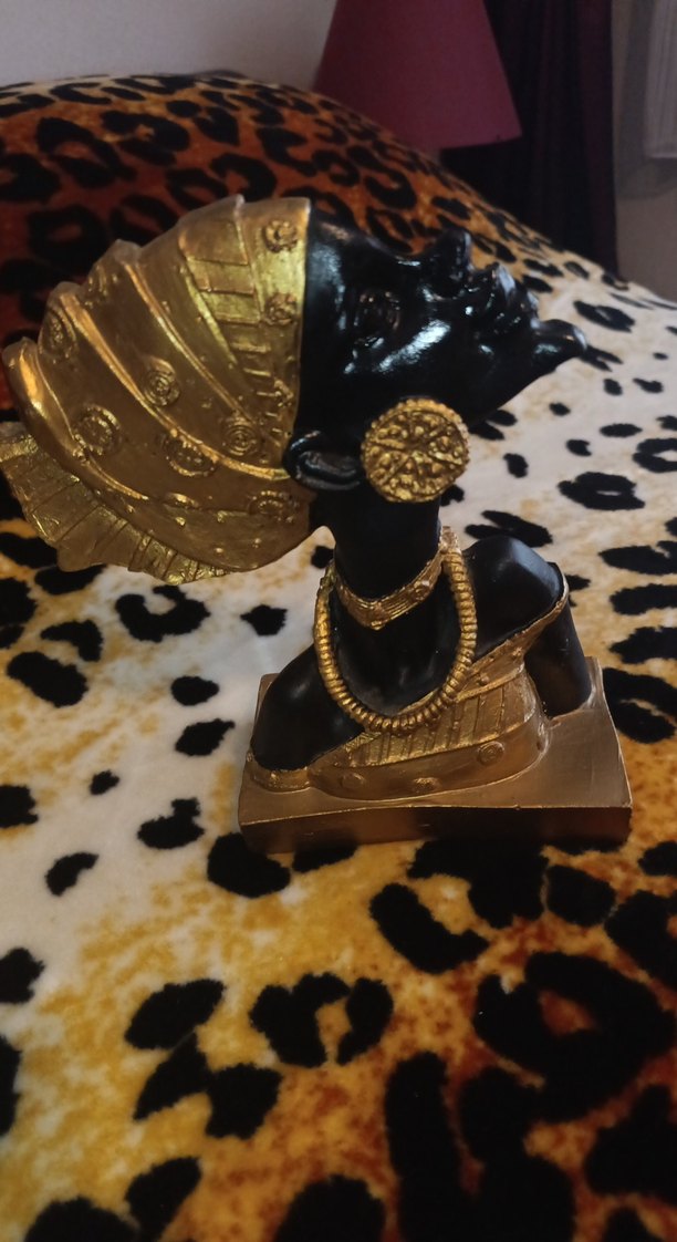 Parlak altın kaplama kadın figürü, detaylı başlık, küpe ve kolye ile işçilik ön planda.