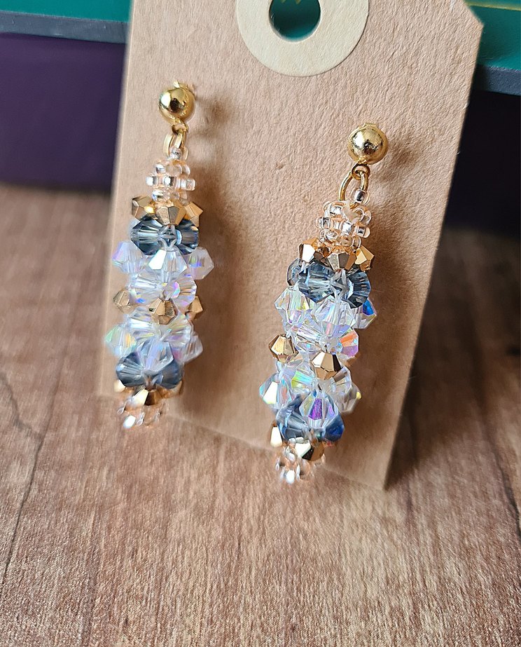 Swarovski kristalleri, aktın kaplama kristalleri de barındırak özel tasarım küpeler. Çağdaş tarzda altın renkli kadın küpeleri, balo, düğün, nikah ve şık etkinlikler için uygundur.