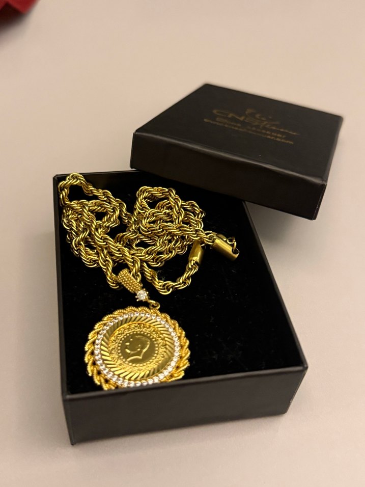 Zincir detaylı, yılan desenli altın renkli kolye. Parlak yüzeye sahip, normal midi uzunlukta ve günlük kullanıma uygun.