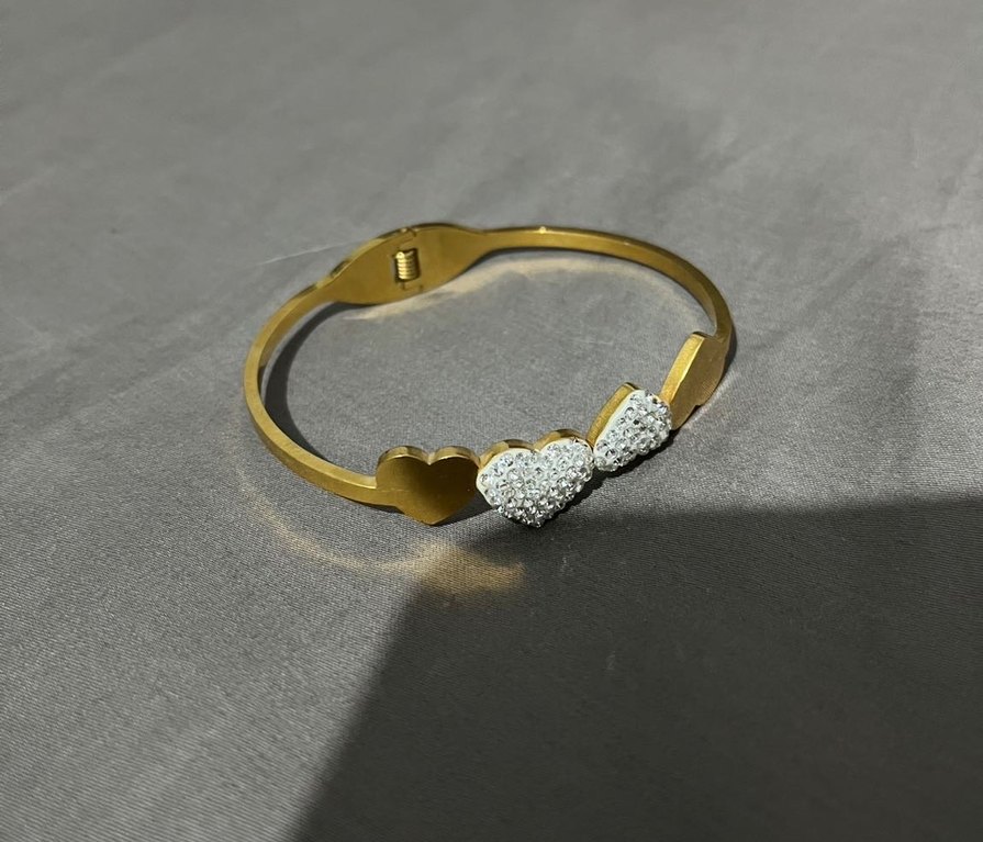 Altın kaplama, tokalı kadın bileklik. Üç kalp figürü, ikisi parlak taşlarla süslenmiş, şık ve parlak bir görünüm sağlar.