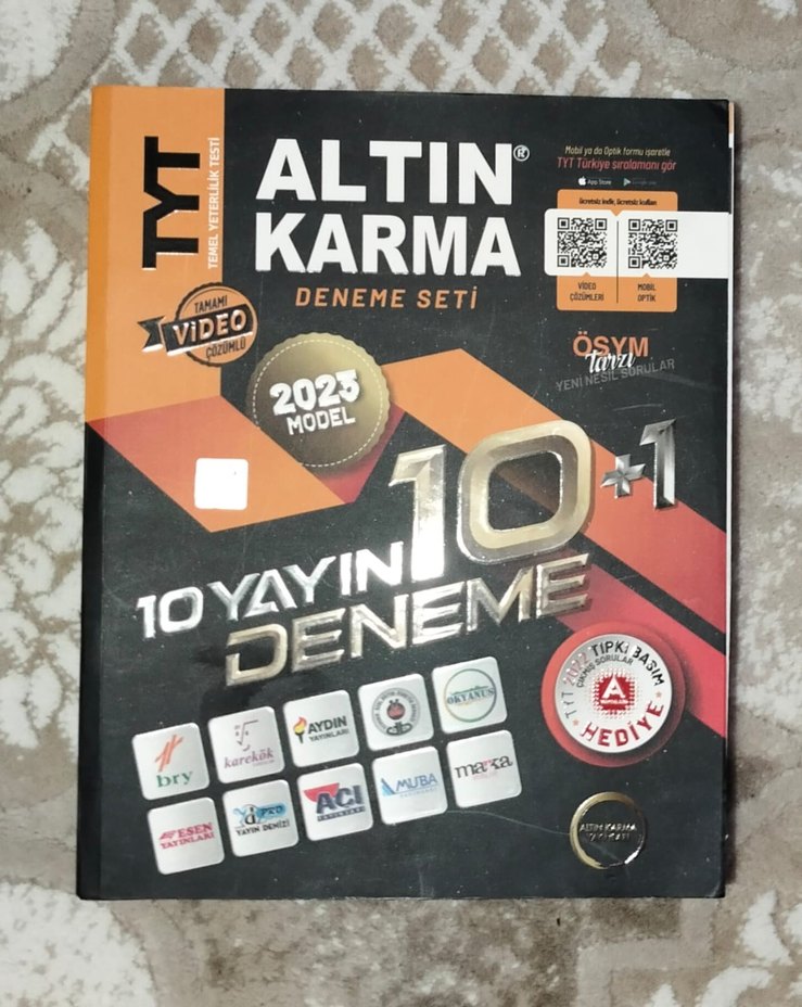 Altın Karma TYT deneme seti, 2023 model 10 deneme ve video çözümleri içerir. Güncel sorular ve ek hediye deneme sunar.