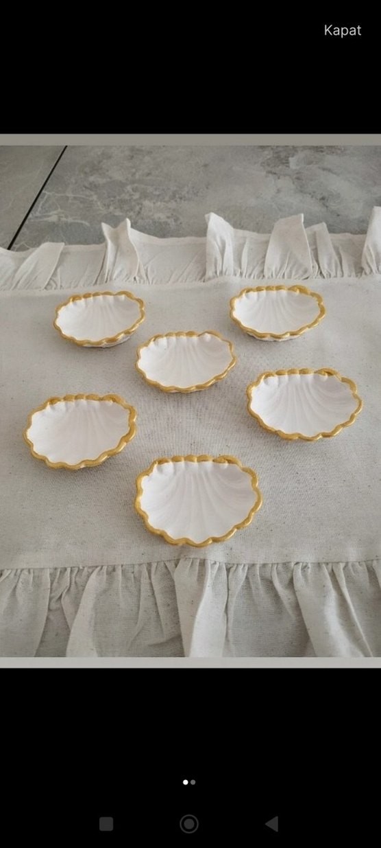 Altın kenarlı beyaz kabuk şeklinde tabaklar, klasik nakış desenine sahip. Sofralara zarif bir dokunuş katıyor. ️