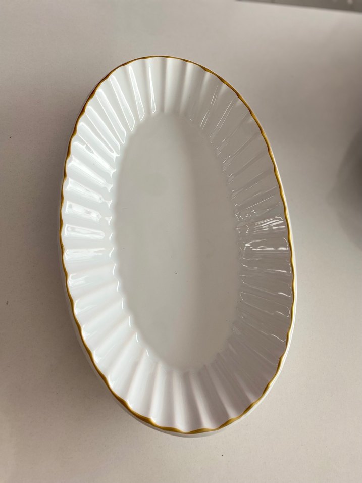 Altın kenarlı, parlak beyaz servis tabağı, dalgalı deseniyle şık sunumlar için uygundur. Stok vardır kaç adet sipariş etmek isterseniz iletişime geçebilirsiniz ilan açarım.