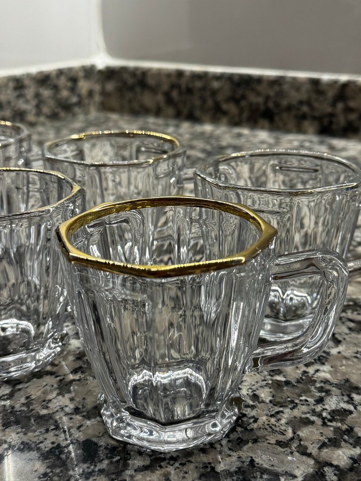 Parlak altın kenarlara sahip, dokulu cam kupalar. Sağlam kulplu, sıcak içecekler için uygun. ☕parlak kenarlarında silinmeler mevcut kırığı yok