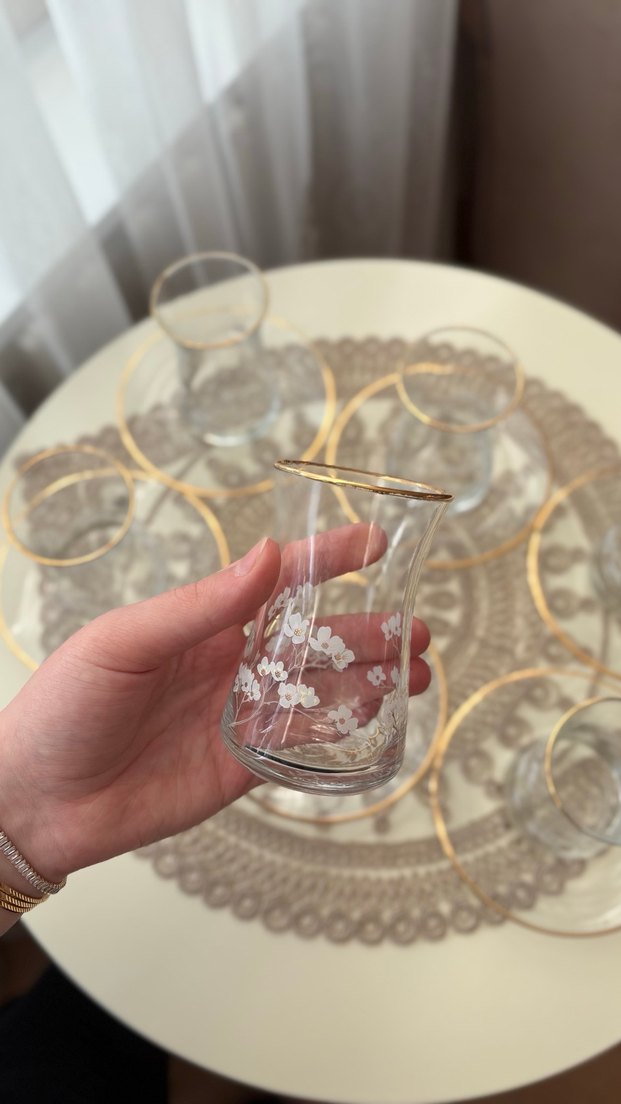 Altın kenarlı ince cam bardak, üzerinde zarif beyaz çiçek desenleri bulunur. Englishhome ihtiyaç fazlası olduğu için satıyorum