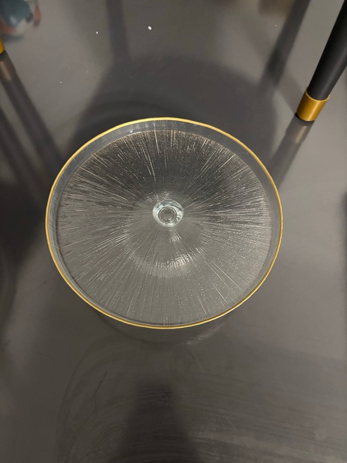 Gri renkte, ince dokulu camdan yapılmış ve altın kenarlı çağdaş bir tabaktır. ️