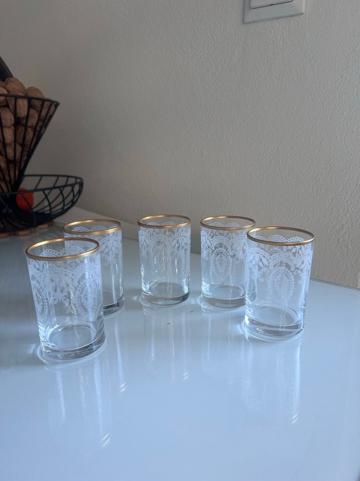 Beş adet, altın kenarlı ve ince beyaz işlemeli cam bardak seti, içecek sunumu için uygundur. ☕