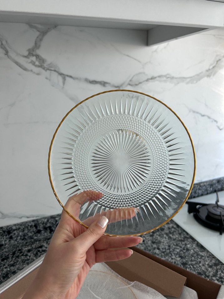 Şeffaf cam tabak, modern klasik tarzda dokulu yüzey ve altın renkli kenar ile şık sofra sunumları için uygundur. ️