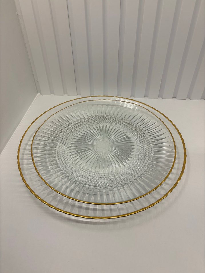 Şeffaf cam tabaklar, hafif altın kenar detaylı, modern klasik tarzda ve desensiz tasarıma sahip. ️