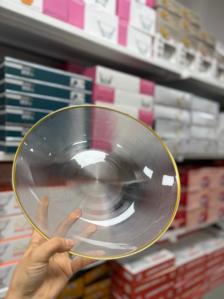 İnce altın kenarıyla şeffaf cam tabak, sade ve zarif bir dokunuş sunar. Sofranıza şıklık katar. Büyük boy meyve tabağı
