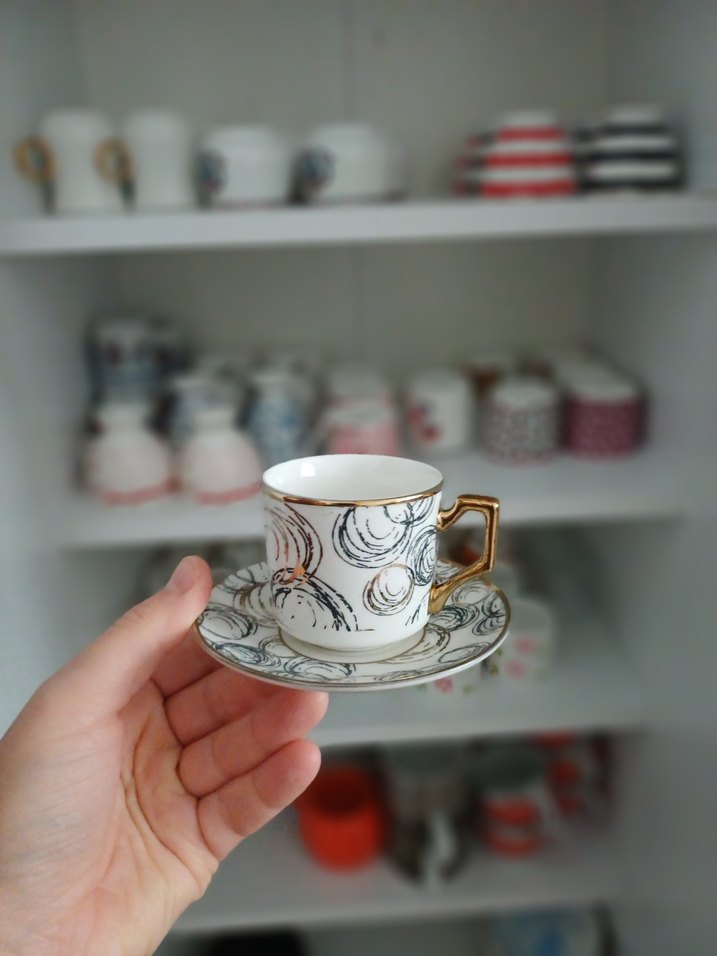 Gri ve altın desenlere sahip beyaz kahve fincanı ve tabağı, altın renkli kulpla birlikte sunuluyor. ☕️ iki kisiliktir