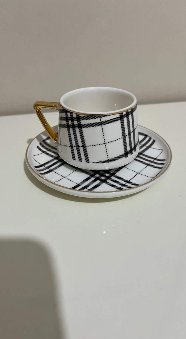 Kupa ve tabağı üzerinde koyu ekose desenleri ve fincanda altın renkli kulp bulunan . Klasik ve zarif tasarım sunar. ☕ tek fincan 1 adettir
