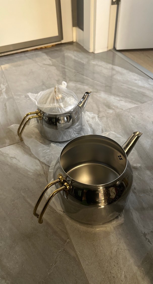 Parlak yüzeyli, altın kulplu gri çaydanlık seti. Büyük ve küçük olmak üzere iki parçadan oluşur, dökme için pratik ağızlıkları vardır. Maxi boy .