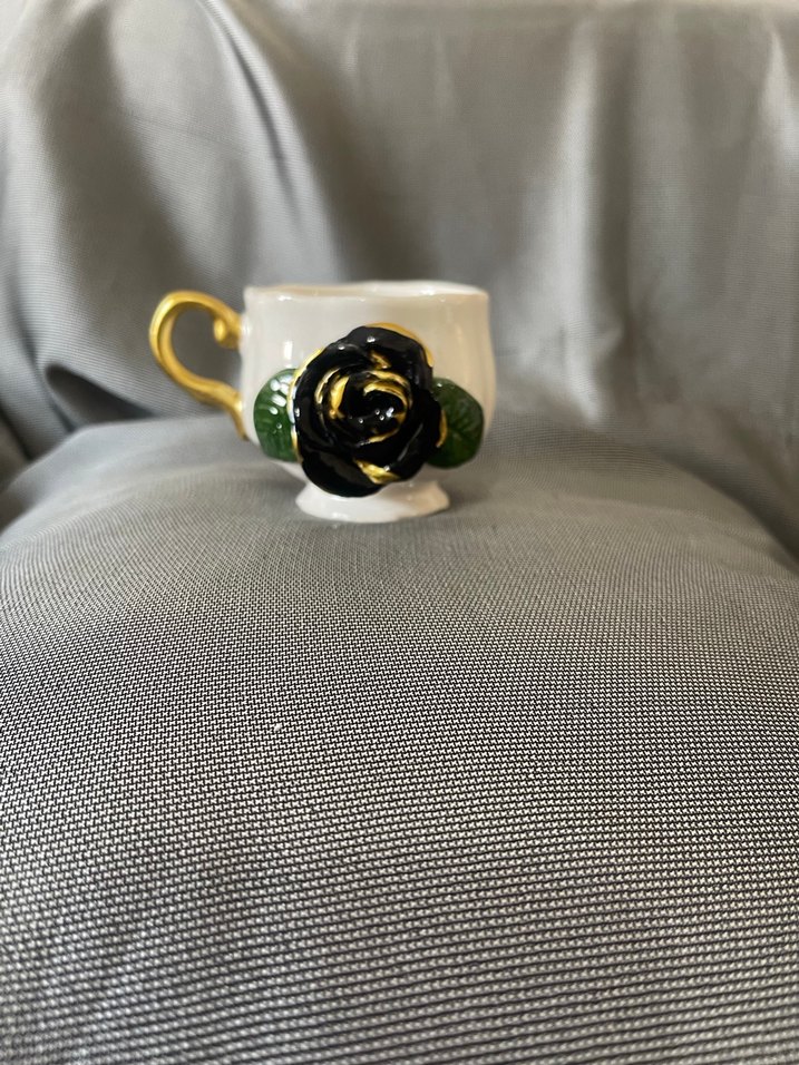 Ön kısmında siyah gül ve yeşil yaprak süsü bulunan, altın kulplu beyaz fincan. ☕Ürünümüz satılmıştır dilerseniz sipariş verebilirsiniz
