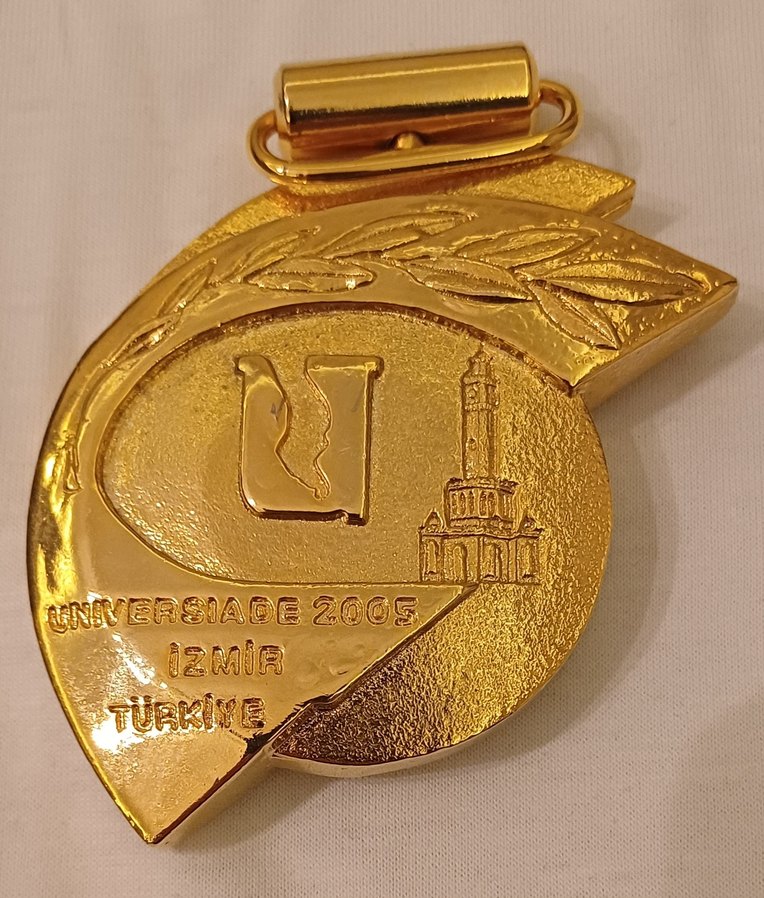 2005 yılında İzmir'de yapılan 23. Üniversiteler arası olimpiyatları için üretilen İzmir Universiade'sini simgeleyen parlak altın renkli erkek madslya. Klasik Parisian tarzında, geleneksel görünümlü.