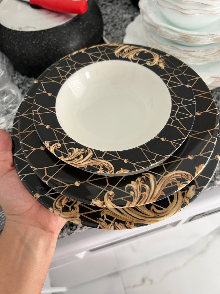 Altın detaylı siyah tabak seti, çukur ve düz tabaklardan oluşur, şık desenlerle süslenmiştir. ️kusurlarını deforme olan yerlerini koydum . Kullanmıyorum fazlalık olduğu için satışta .