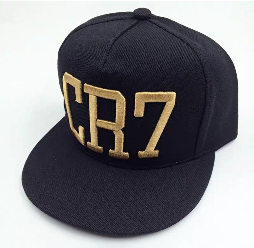 Siyah renkli, altın nakışlı 'CR7' harfleriyle sokak stiline uygun şapka.