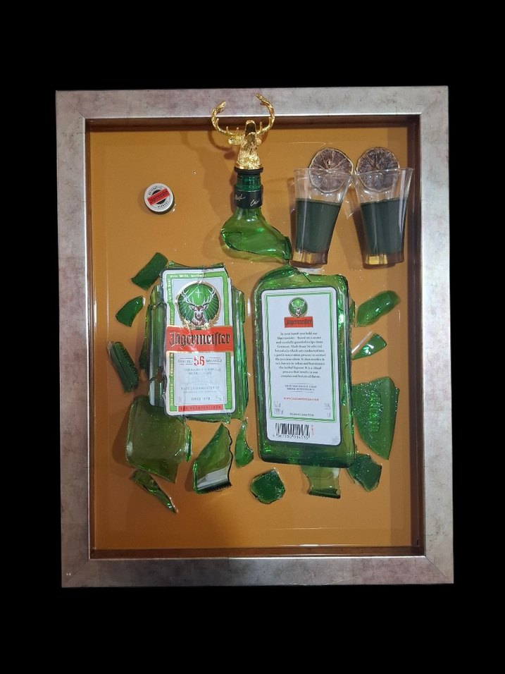 Parlak altın çerçevede jagermeister şişe parçaları ve iki shot bardağı içeren kırık cam düzenlemesi yer alıyor. ️